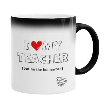 i love my teacher but no the homework outline, Color changing magic Mug, ceramic, 330ml when adding hot liquid inside, the black colour desappears (1 pcs)