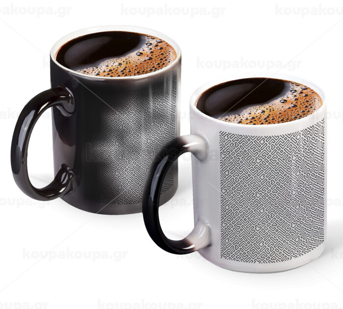 A shiny black magic cup of excellent quality with vibrant colors. With coffee, tea, water or any liquid from 50 degrees and above, the cup begins to reveal the surprise design. As soon as the liquid falls below 50 degrees and starts to cool, it turns black again.