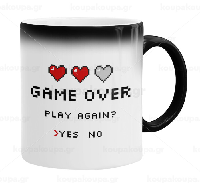 GAME OVER, Play again? YES - NO, Color changing magic Mug, ceramic, 330ml when adding hot liquid inside, the black colour desappears (1 pcs)