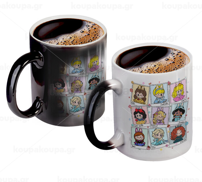 A shiny black magic cup of excellent quality with vibrant colors. With coffee, tea, water or any liquid from 50 degrees and above, the cup begins to reveal the surprise design. As soon as the liquid falls below 50 degrees and starts to cool, it turns black again.