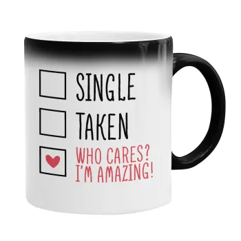 Single, Taken, Who cares i'm amazing, Color changing magic Mug, ceramic, 330ml when adding hot liquid inside, the black colour desappears (1 pcs)