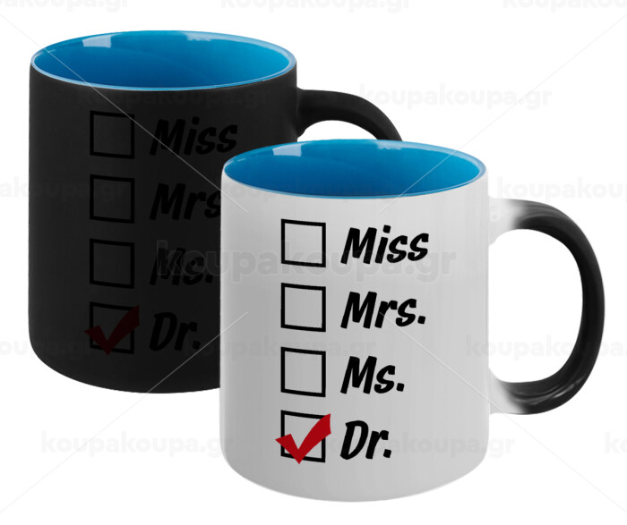 Miss, Mrs, Ms, DR, Κούπα Μαγική εσωτερικό μπλε, κεραμική 330ml που αλλάζει χρώμα με το ζεστό ρόφημα