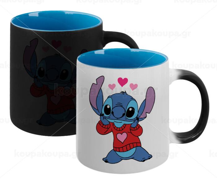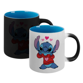 Stitch heart, Κούπα Μαγική εσωτερικό μπλε, κεραμική 330ml που αλλάζει χρώμα με το ζεστό ρόφημα