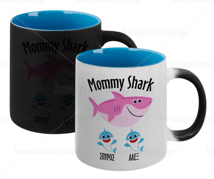 Mommy Shark (με ονόματα παιδικά), Κούπα Μαγική εσωτερικό μπλε, κεραμική 330ml που αλλάζει χρώμα με το ζεστό ρόφημα