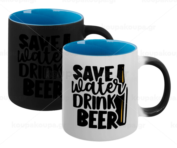 Save Water, Drink BEER, Κούπα Μαγική εσωτερικό μπλε, κεραμική 330ml που αλλάζει χρώμα με το ζεστό ρόφημα
