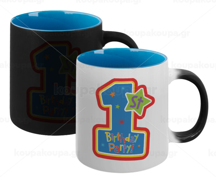 Happy 1st Birthday, Κούπα Μαγική εσωτερικό μπλε, κεραμική 330ml που αλλάζει χρώμα με το ζεστό ρόφημα