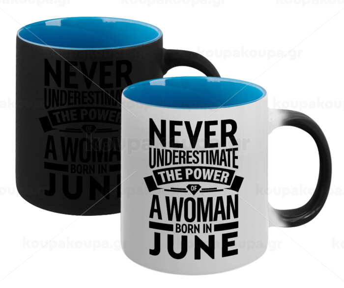 Never Underestimate the poer of a Woman born in..., Κούπα Μαγική εσωτερικό μπλε, κεραμική 330ml που αλλάζει χρώμα με το ζεστό ρόφημα