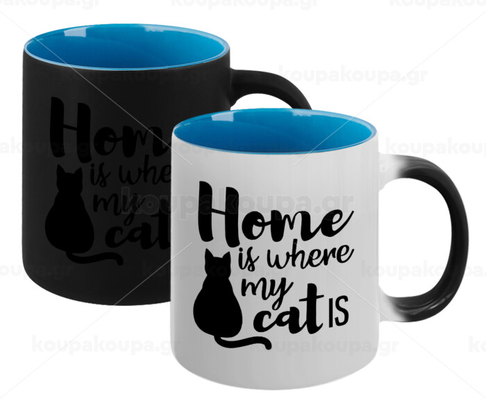 Home is where my cat is!, Κούπα Μαγική εσωτερικό μπλε, κεραμική 330ml που αλλάζει χρώμα με το ζεστό ρόφημα