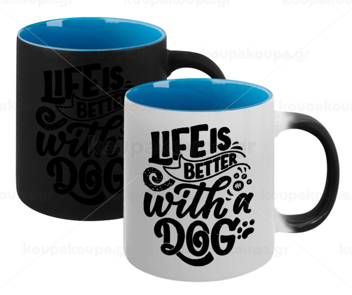 Life is better with a DOG, Κούπα Μαγική εσωτερικό μπλε, κεραμική 330ml που αλλάζει χρώμα με το ζεστό ρόφημα