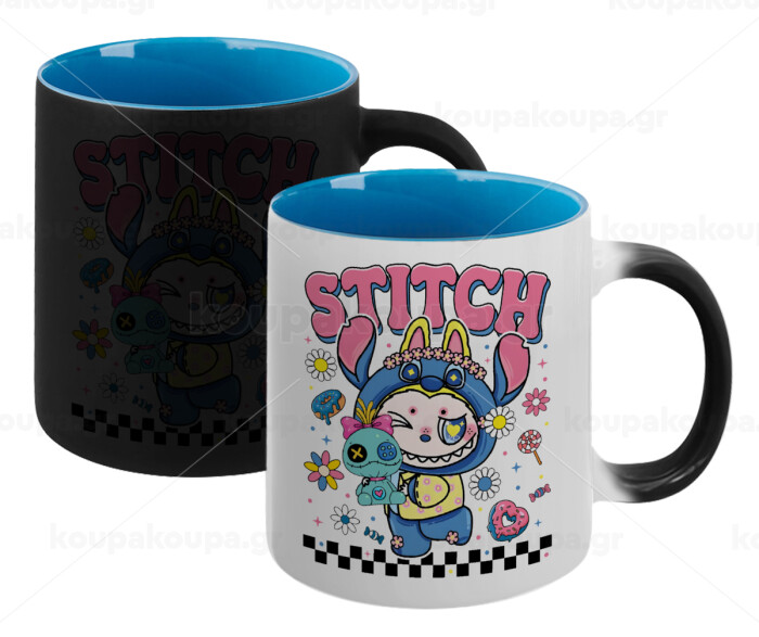 Labubu Stitch, Κούπα Μαγική εσωτερικό μπλε, κεραμική 330ml που αλλάζει χρώμα με το ζεστό ρόφημα