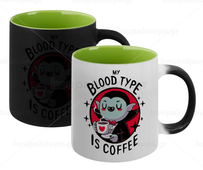 My blood type is coffee, Κούπα Μαγική εσωτερικό πράσινο, κεραμική 330ml που αλλάζει χρώμα με το ζεστό ρόφημα