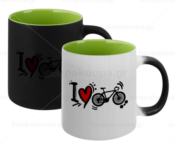 I love my bike, Κούπα Μαγική εσωτερικό πράσινο, κεραμική 330ml που αλλάζει χρώμα με το ζεστό ρόφημα