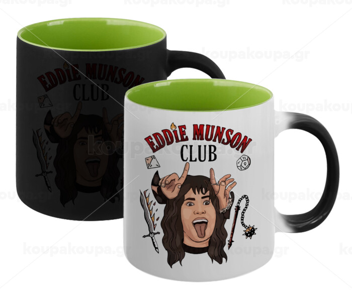 Eddie Munson, Hellfire CLub, Stranger Things, Κούπα Μαγική εσωτερικό πράσινο, κεραμική 330ml που αλλάζει χρώμα με το ζεστό ρόφημα