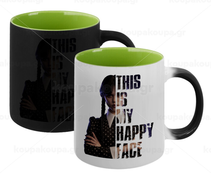 Wednesday, This is my happy face, Κούπα Μαγική εσωτερικό πράσινο, κεραμική 330ml που αλλάζει χρώμα με το ζεστό ρόφημα