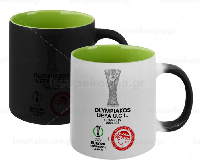 Olympiacos UEFA Europa Conference League Champion 2023/24, Κούπα Μαγική εσωτερικό πράσινο, κεραμική 330ml που αλλάζει χρώμα με το ζεστό ρόφημα