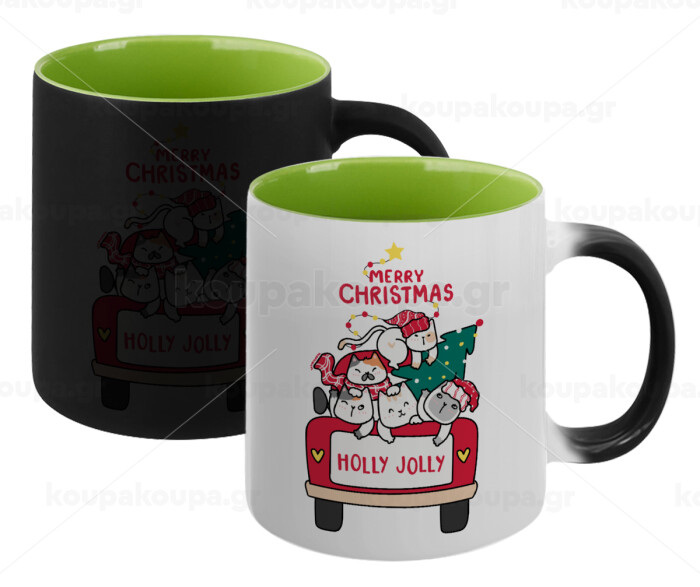 Merry Christmas cats in car, Κούπα Μαγική εσωτερικό πράσινο, κεραμική 330ml που αλλάζει χρώμα με το ζεστό ρόφημα