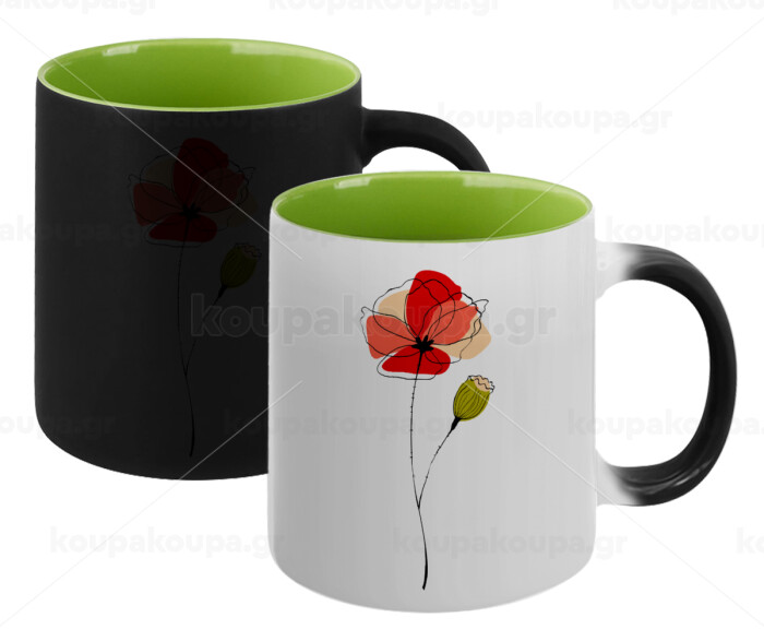Red poppy flowers papaver, Κούπα Μαγική εσωτερικό πράσινο, κεραμική 330ml που αλλάζει χρώμα με το ζεστό ρόφημα