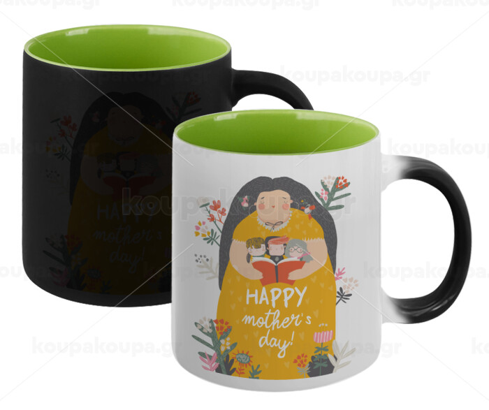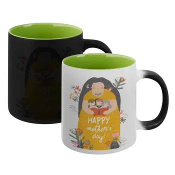 Cute mother reading book, happy mothers day, Κούπα Μαγική εσωτερικό πράσινο, κεραμική 330ml που αλλάζει χρώμα με το ζεστό ρόφημα