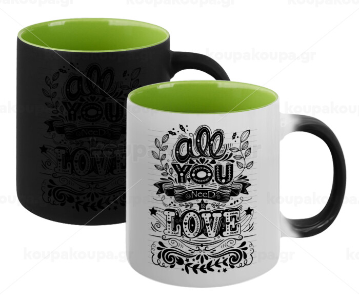 All you need is love, Κούπα Μαγική εσωτερικό πράσινο, κεραμική 330ml που αλλάζει χρώμα με το ζεστό ρόφημα