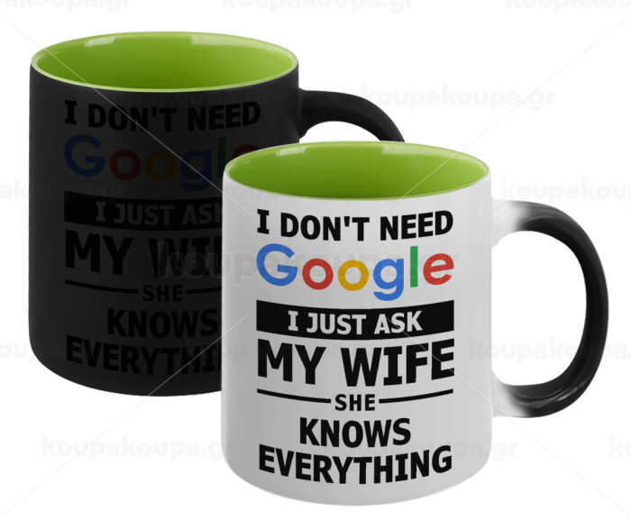 I don't need Google, just ask my WIFE, Κούπα Μαγική εσωτερικό πράσινο, κεραμική 330ml που αλλάζει χρώμα με το ζεστό ρόφημα