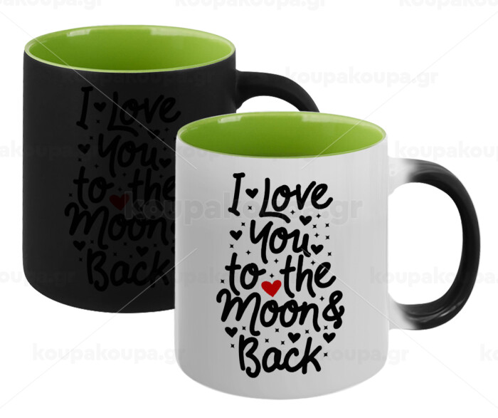 I love you to the moon and back with hearts, Κούπα Μαγική εσωτερικό πράσινο, κεραμική 330ml που αλλάζει χρώμα με το ζεστό ρόφημα