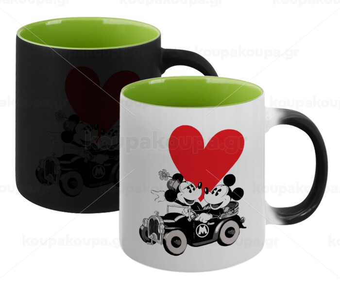 Mickey & Minnie love car, Κούπα Μαγική εσωτερικό πράσινο, κεραμική 330ml που αλλάζει χρώμα με το ζεστό ρόφημα