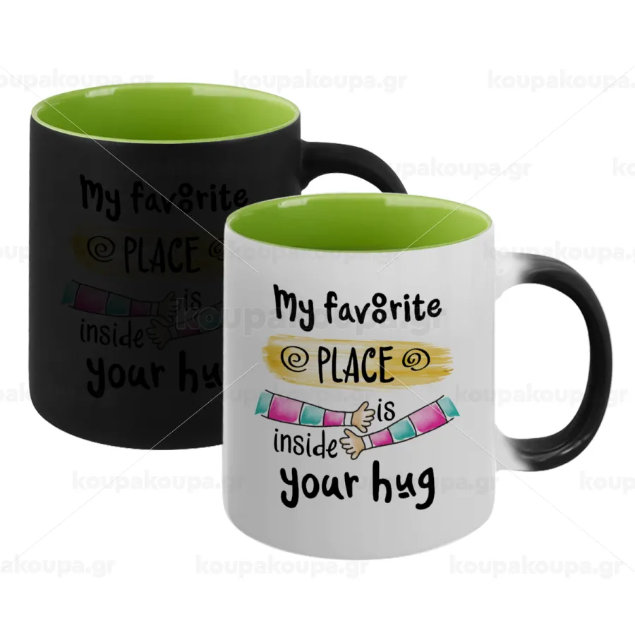 My favorite place is inside your HUG, Κούπα Μαγική εσωτερικό πράσινο, κεραμική 330ml που αλλάζει χρώμα με το ζεστό ρόφημα