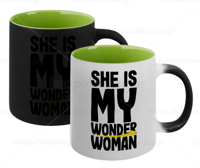 She is my wonder woman, Κούπα Μαγική εσωτερικό πράσινο, κεραμική 330ml που αλλάζει χρώμα με το ζεστό ρόφημα