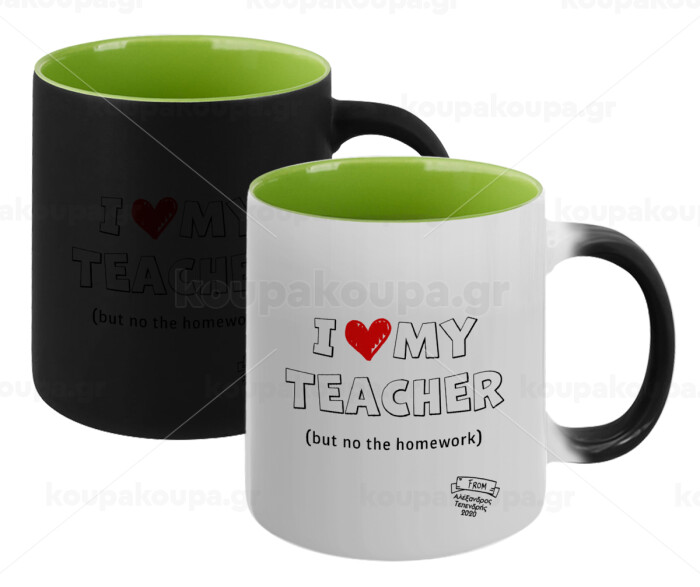 i love my teacher but no the homework outline, Κούπα Μαγική εσωτερικό πράσινο, κεραμική 330ml που αλλάζει χρώμα με το ζεστό ρόφημα