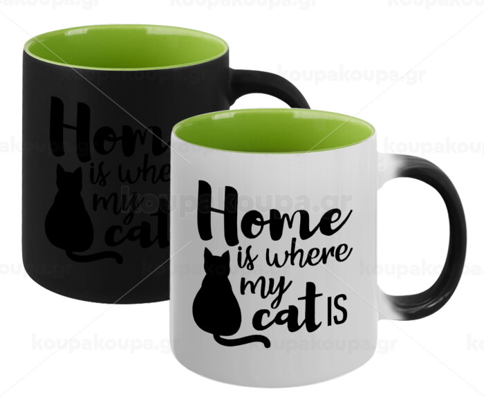 Home is where my cat is!, Κούπα Μαγική εσωτερικό πράσινο, κεραμική 330ml που αλλάζει χρώμα με το ζεστό ρόφημα
