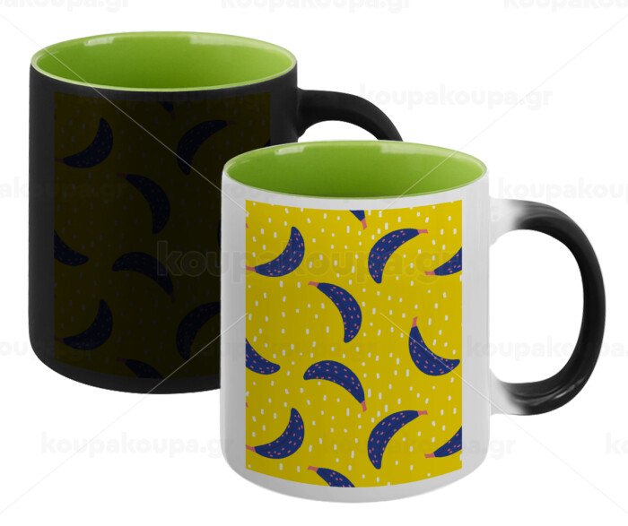 Yellow seamless with blue bananas, Κούπα Μαγική εσωτερικό πράσινο, κεραμική 330ml που αλλάζει χρώμα με το ζεστό ρόφημα