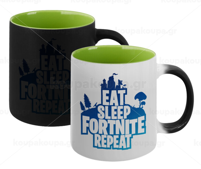 Eat Sleep Fortnite Repeat, Κούπα Μαγική εσωτερικό πράσινο, κεραμική 330ml που αλλάζει χρώμα με το ζεστό ρόφημα