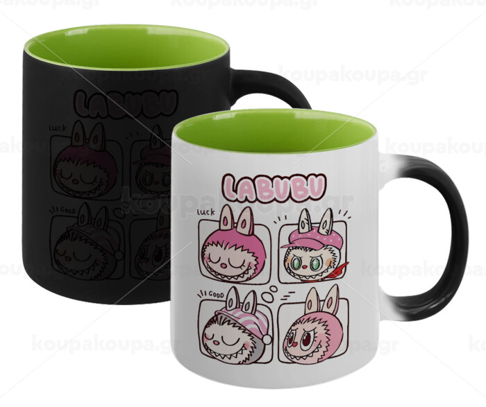 Labubu pink, Κούπα Μαγική εσωτερικό πράσινο, κεραμική 330ml που αλλάζει χρώμα με το ζεστό ρόφημα