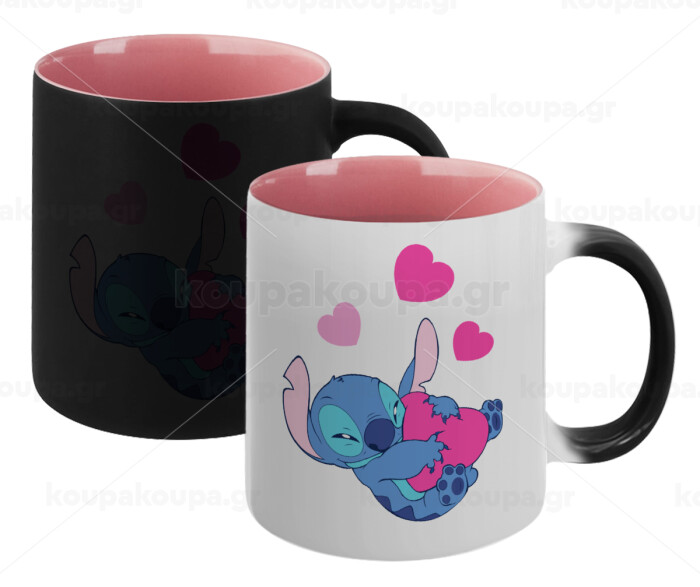 Lilo & Stitch hugs and hearts, Κούπα Μαγική εσωτερικό ΡΟΖ, κεραμική 330ml που αλλάζει χρώμα με το ζεστό ρόφημα