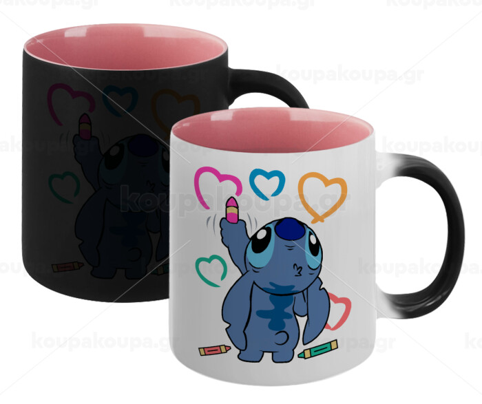 Lilo & Stitch painting, Κούπα Μαγική εσωτερικό ΡΟΖ, κεραμική 330ml που αλλάζει χρώμα με το ζεστό ρόφημα