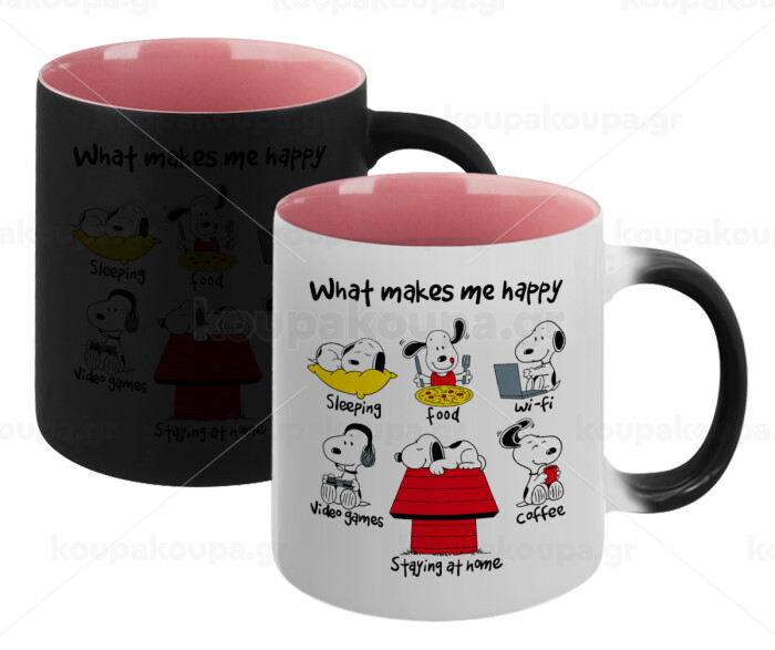 Snoopy what makes my happy, Κούπα Μαγική εσωτερικό ΡΟΖ, κεραμική 330ml που αλλάζει χρώμα με το ζεστό ρόφημα
