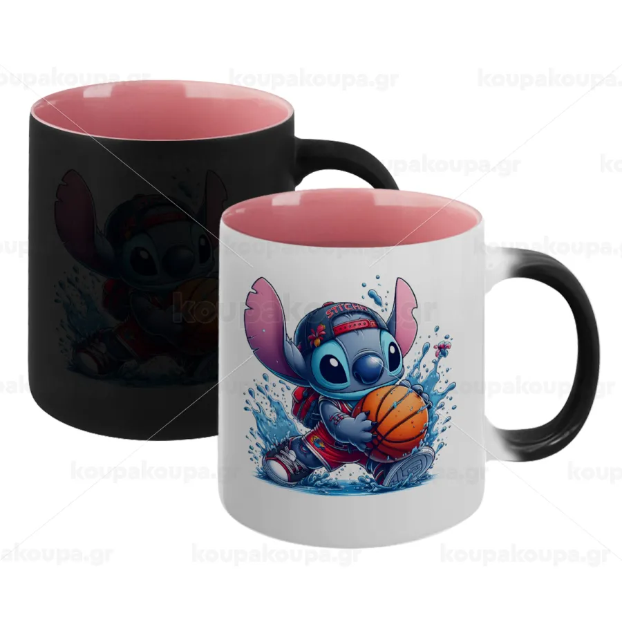 Stitch Basketball, Κούπα Μαγική εσωτερικό ΡΟΖ, κεραμική 330ml που αλλάζει χρώμα με το ζεστό ρόφημα