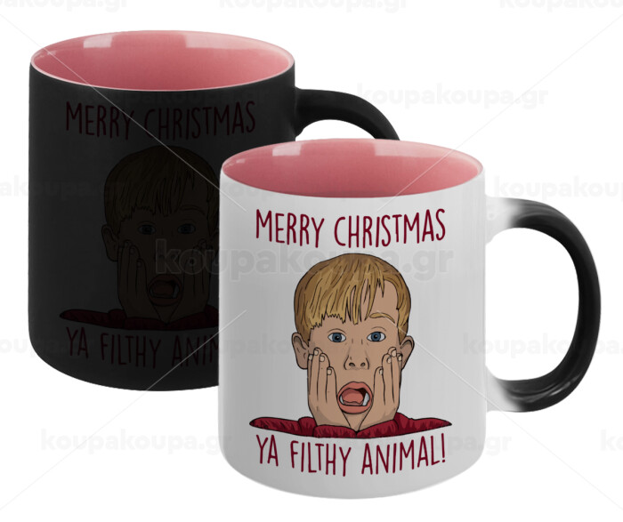 home alone, Merry Christmas ya filthy animal, Κούπα Μαγική εσωτερικό ΡΟΖ, κεραμική 330ml που αλλάζει χρώμα με το ζεστό ρόφημα