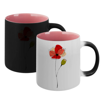 Red poppy flowers papaver, Κούπα Μαγική εσωτερικό ΡΟΖ, κεραμική 330ml που αλλάζει χρώμα με το ζεστό ρόφημα