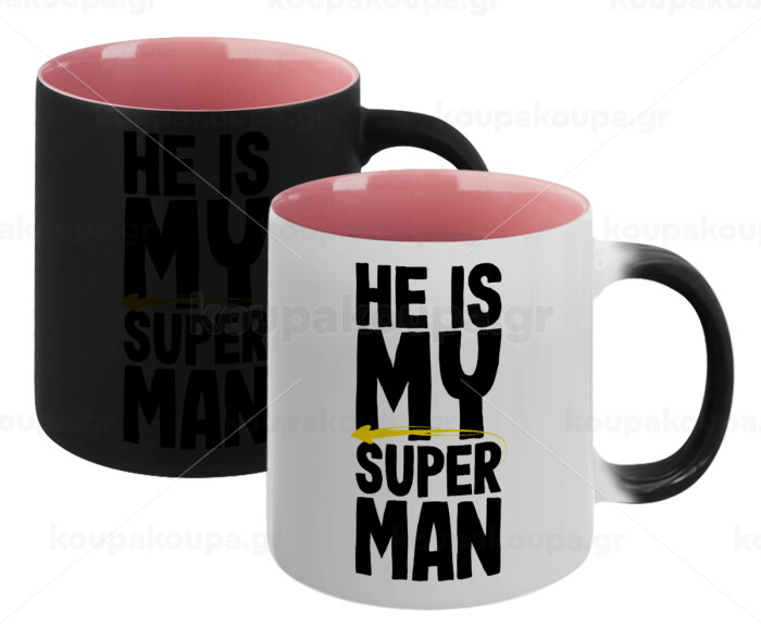 He is my superman, Κούπα Μαγική εσωτερικό ΡΟΖ, κεραμική 330ml που αλλάζει χρώμα με το ζεστό ρόφημα