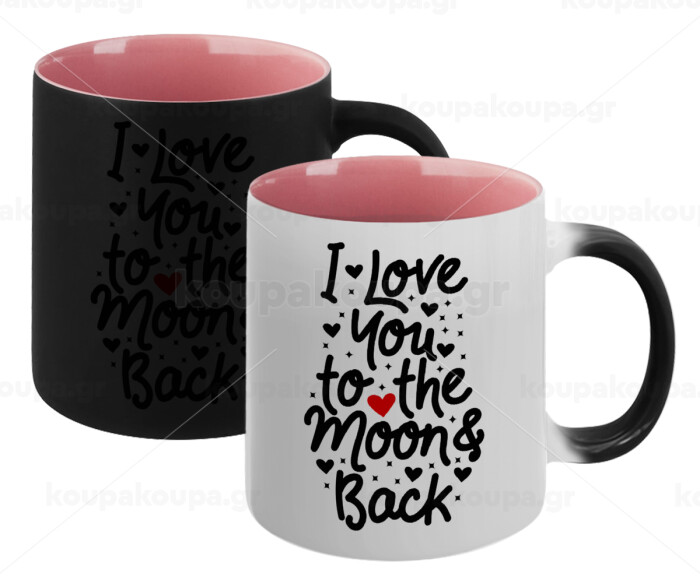 I love you to the moon and back with hearts, Κούπα Μαγική εσωτερικό ΡΟΖ, κεραμική 330ml που αλλάζει χρώμα με το ζεστό ρόφημα