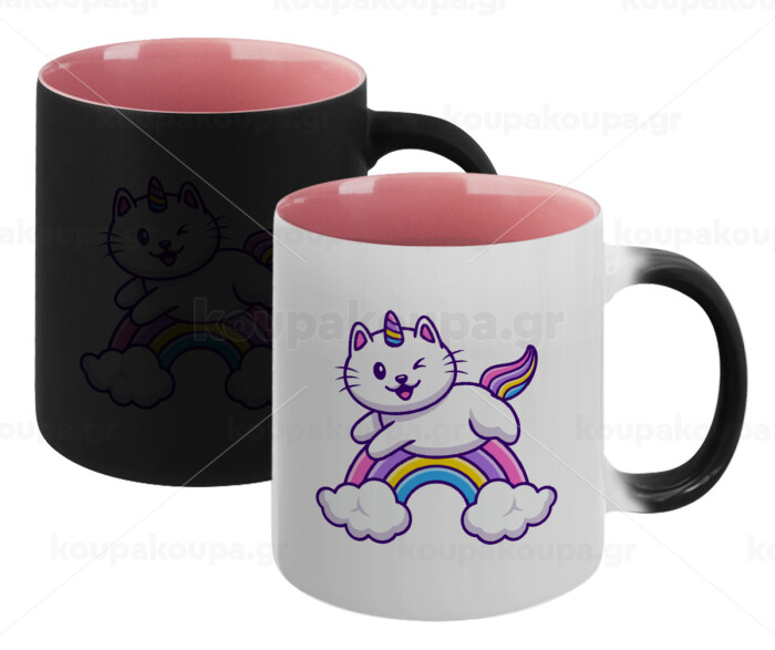 Cute cat unicorn, Κούπα Μαγική εσωτερικό ΡΟΖ, κεραμική 330ml που αλλάζει χρώμα με το ζεστό ρόφημα