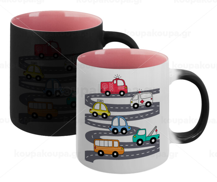 Hand drawn childish set with cars, Κούπα Μαγική εσωτερικό ΡΟΖ, κεραμική 330ml που αλλάζει χρώμα με το ζεστό ρόφημα