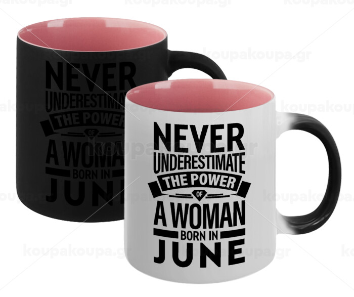 Never Underestimate the poer of a Woman born in..., Κούπα Μαγική εσωτερικό ΡΟΖ, κεραμική 330ml που αλλάζει χρώμα με το ζεστό ρόφημα