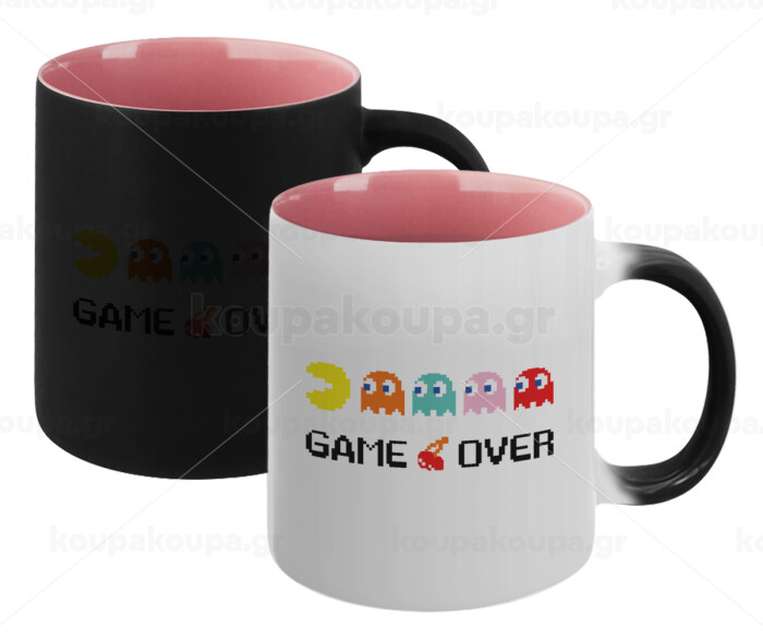 GAME OVER pac-man, Κούπα Μαγική εσωτερικό ΡΟΖ, κεραμική 330ml που αλλάζει χρώμα με το ζεστό ρόφημα