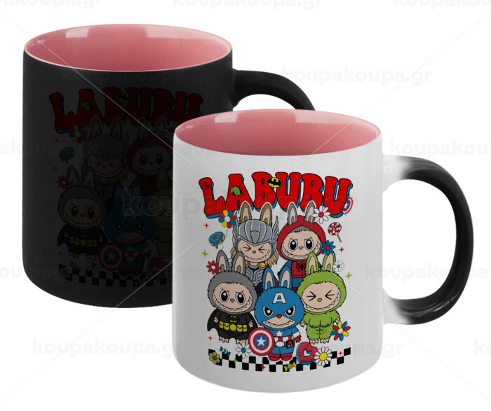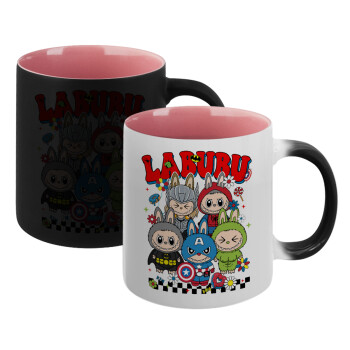 Labubu superheroes, Κούπα Μαγική εσωτερικό ΡΟΖ, κεραμική 330ml που αλλάζει χρώμα με το ζεστό ρόφημα