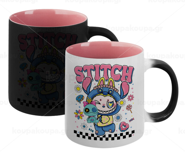 Labubu Stitch, Κούπα Μαγική εσωτερικό ΡΟΖ, κεραμική 330ml που αλλάζει χρώμα με το ζεστό ρόφημα