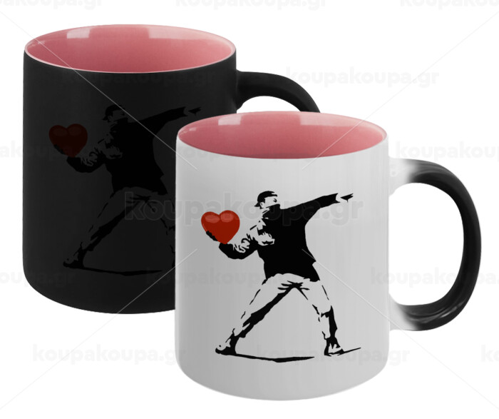 Banksy (The heart thrower), Κούπα Μαγική εσωτερικό ΡΟΖ, κεραμική 330ml που αλλάζει χρώμα με το ζεστό ρόφημα