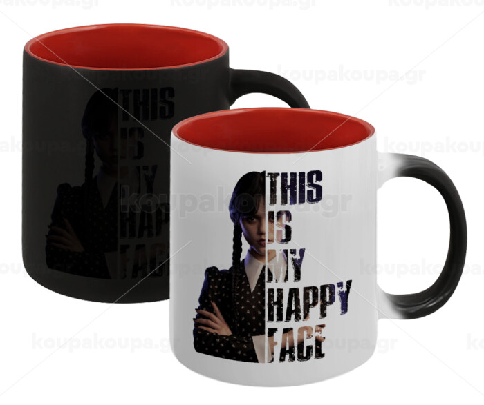 Wednesday, This is my happy face, Κούπα Μαγική εσωτερικό κόκκινο, κεραμική, 330ml που αλλάζει χρώμα με το ζεστό ρόφημα