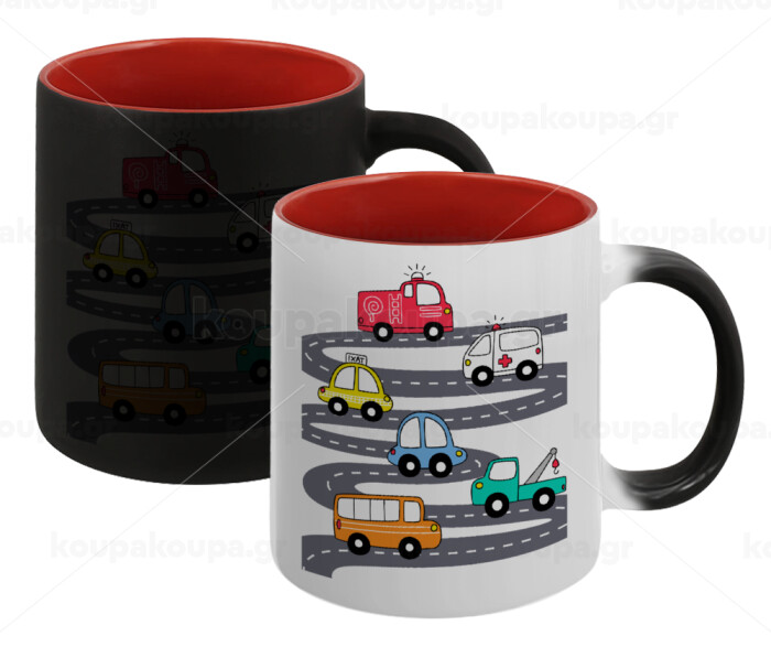 Hand drawn childish set with cars, Κούπα Μαγική εσωτερικό κόκκινο, κεραμική, 330ml που αλλάζει χρώμα με το ζεστό ρόφημα